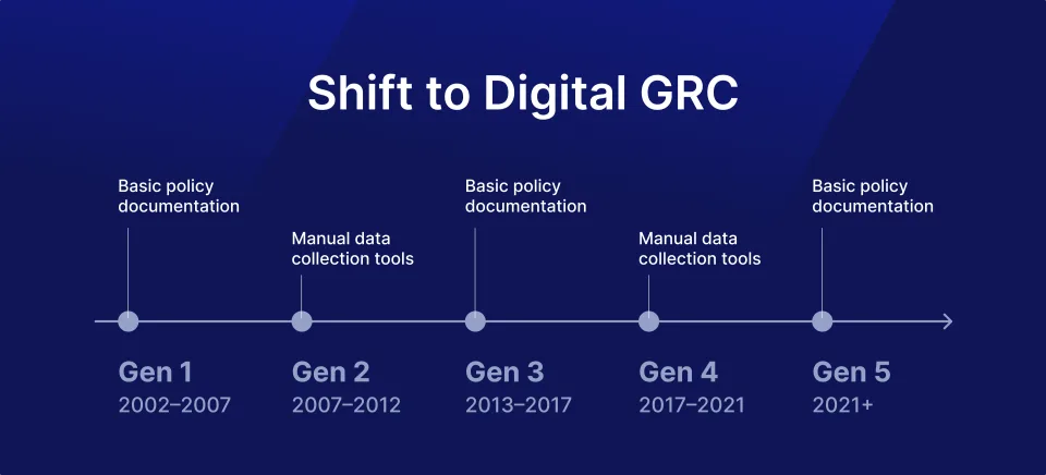 - For the next five years, from 2002 to 2007, which is often called the first generation of GRC, early platforms were just a transition from older, manual, and paper-based methods and were sufficient only for compliance-related challenges, focused on handling internal controls over financial reporting, SOX compliance, and related IT controls. As businesses increasingly adopted GRC platforms, they encountered difficulties and limitations stemming from the growth of cybersecurity threats, an increase in regulatory changes, and a substantial volume of data. Cybersecurity and compliance teams expressed growing frustration, citing that existing GRC solutions cannot manage the increased demands of security and compliance in their dynamic environments.