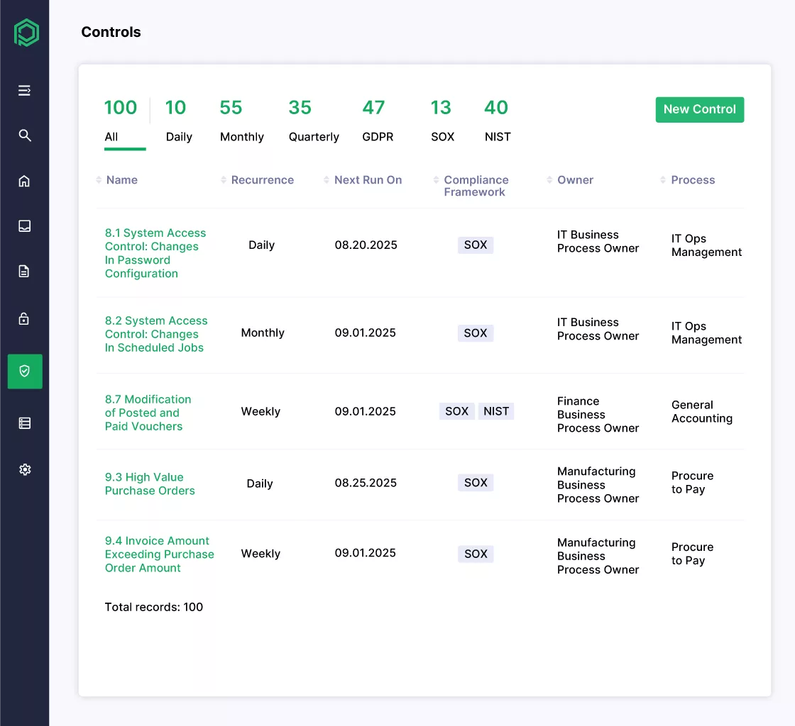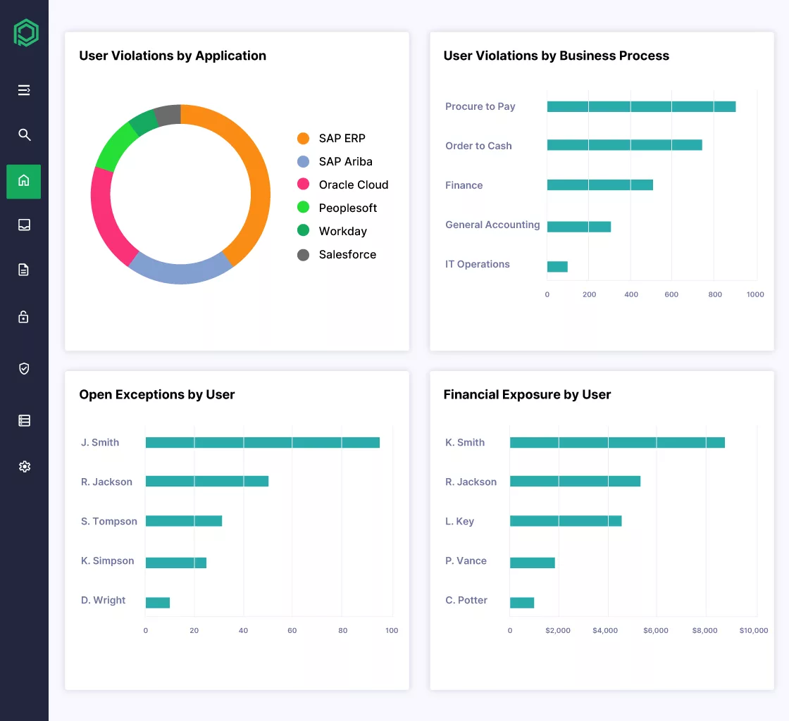 - Continuous control monitoring with 100% transaction monitoring in real-time to identify policy violations as they occur, unlike traditional periodic reviews, detective, and preventive controls, along with policy violation alerts.