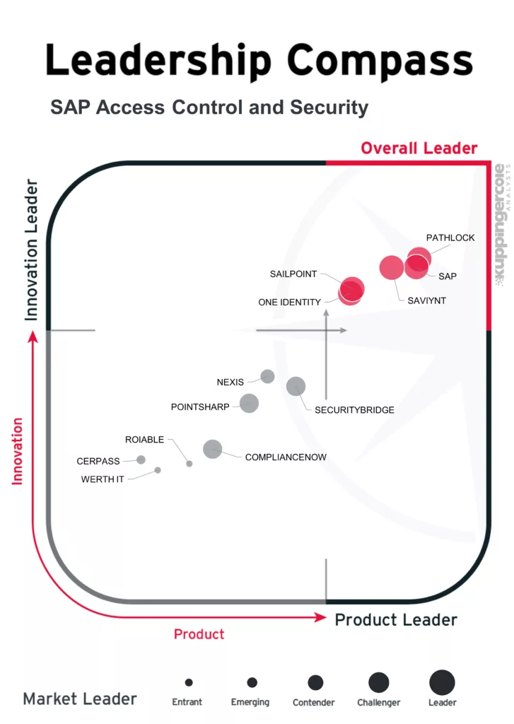 The Leadership Compass for SAP Access Control and Security is an independent analyst evaluation of technology vendors and products that help enterprises secure access, reduce risk, and ensure compliance across SAP environments. The study compares vendors using standardized criteria across three core dimensions: Product Leadership, Innovation Leadership, and Market Leadership. Vendors recognized as Leaders in all three categories are designated as Overall Leaders.