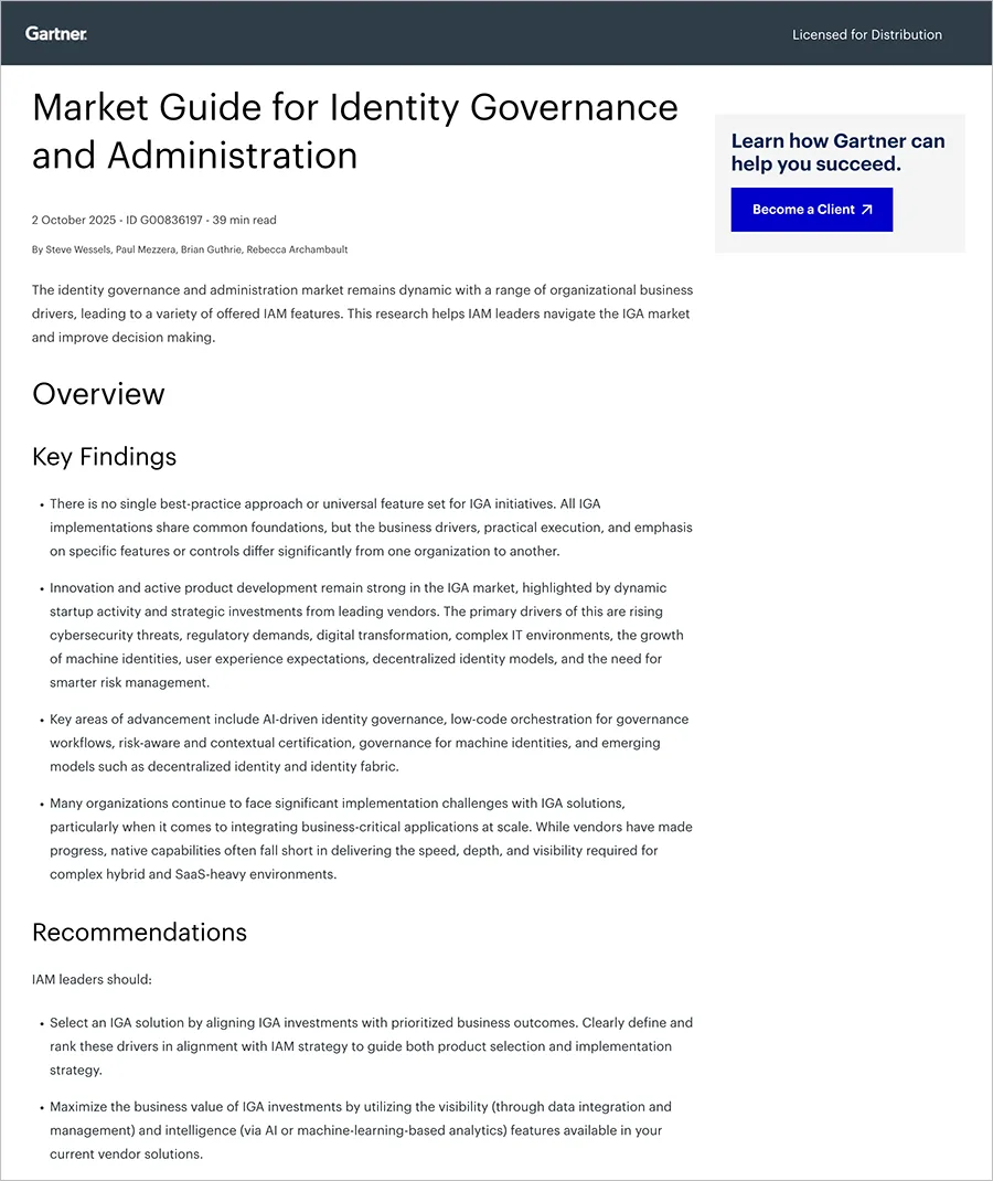 The 2025 Gartner Market Guide for Identity Governance and Administration (IGA) offers a comprehensive overview of the IGA market. It highlights trends, challenges, and vendor capabilities shaping the next generation of identity governance. The guide recognizes Pathlock as a representative vendor.